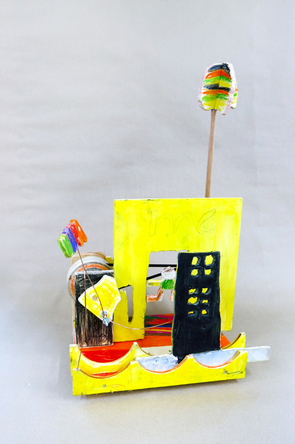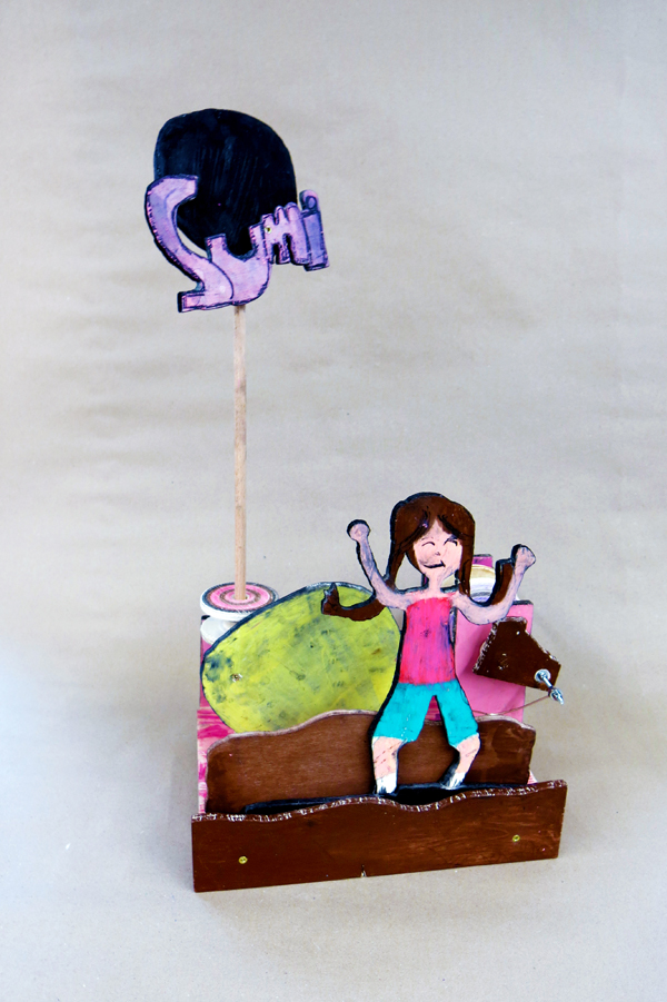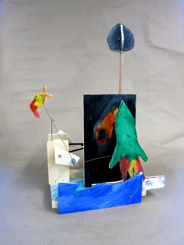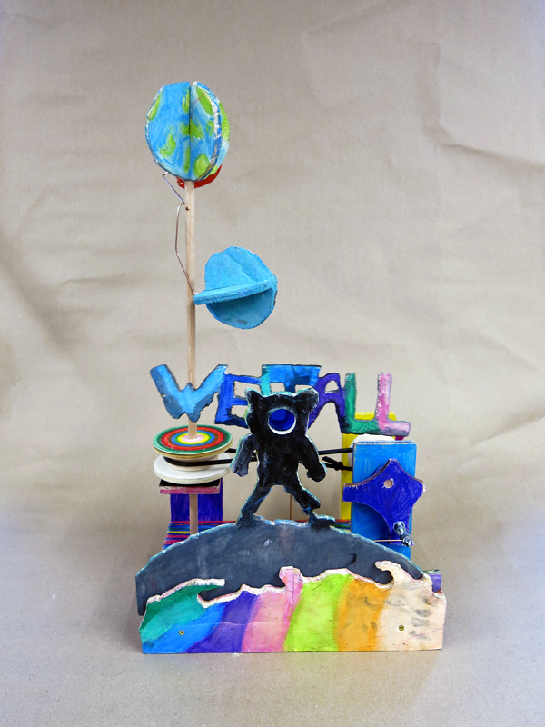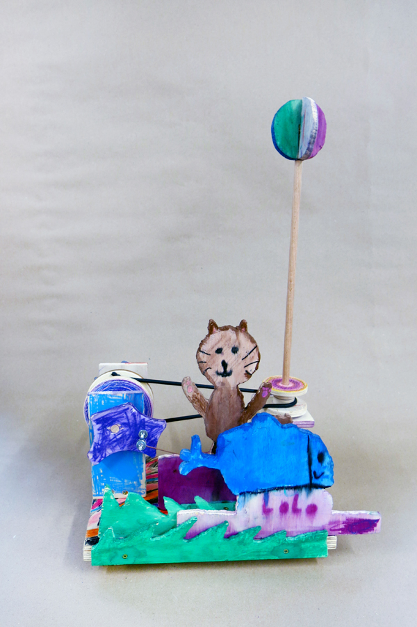 Der Aufbau der Maschine ist vorgegeben, die Ausführung ist bei jedem Kind anders. Unser Modell hat einen rotierenden Oktopuss und eine oszillierende Welle. Die Schüler*innen sollen sich ihre eigene Umgebung ausdenken und Dinge, Wesen oder Tiere gestalten die zu ihrem Thema passen.
