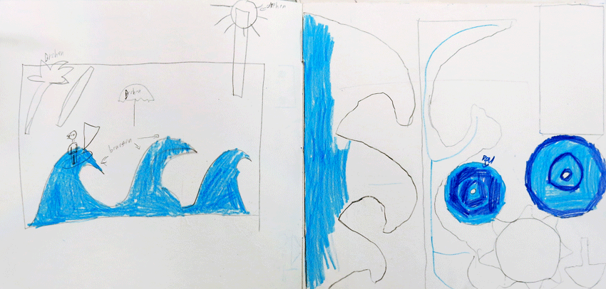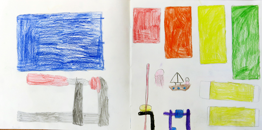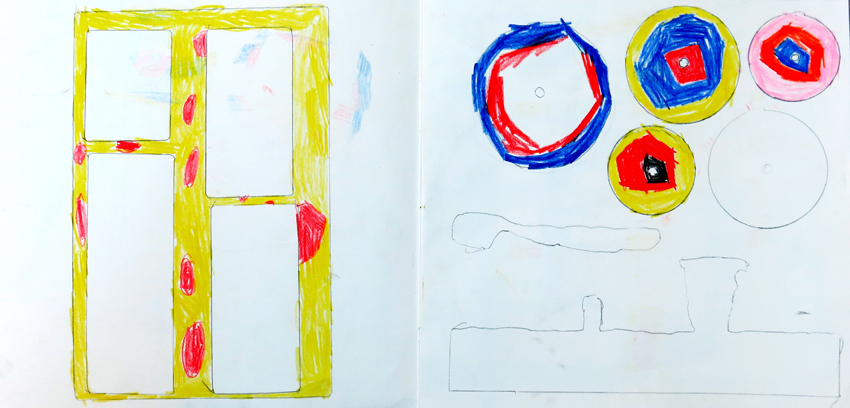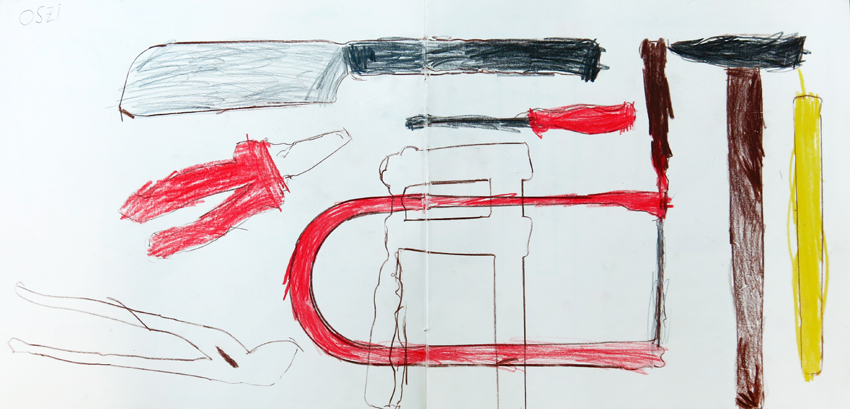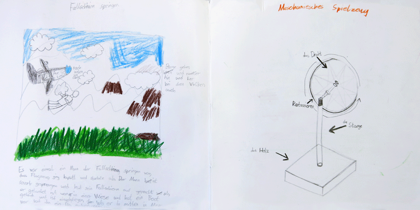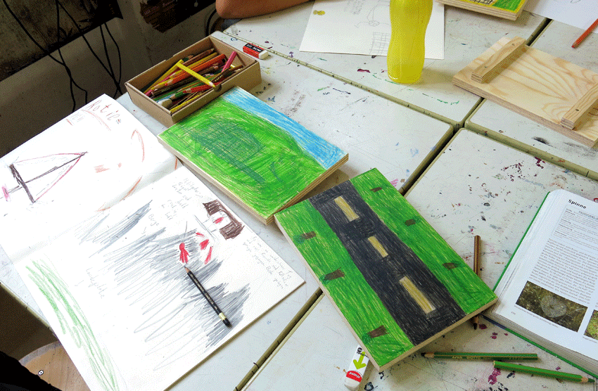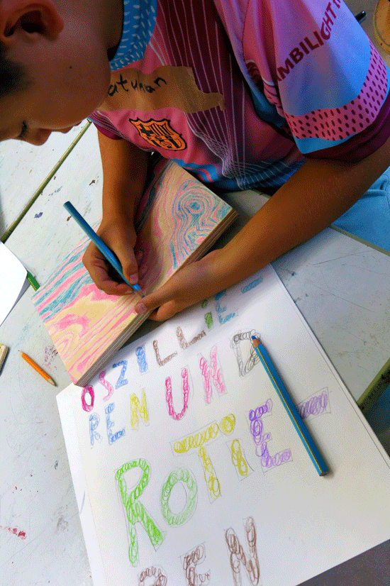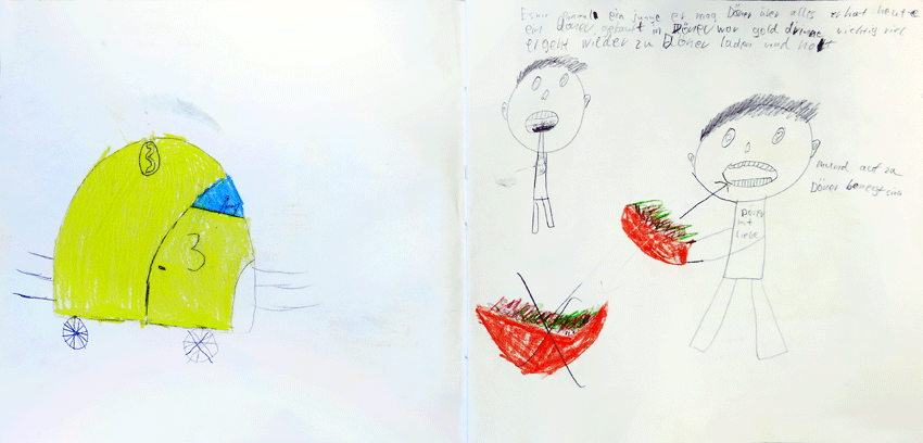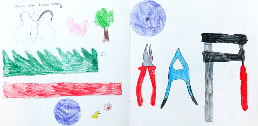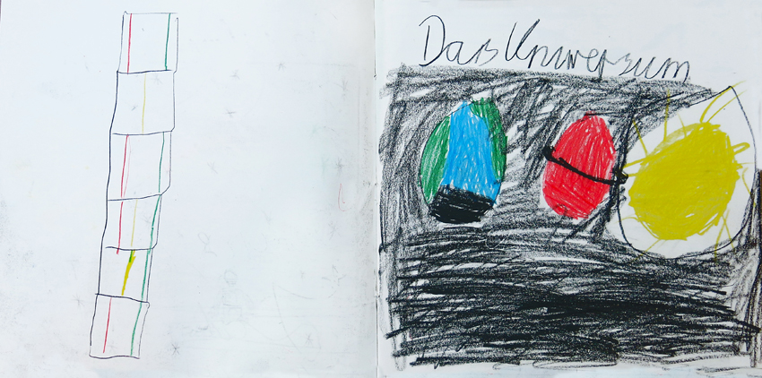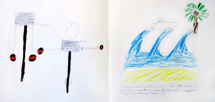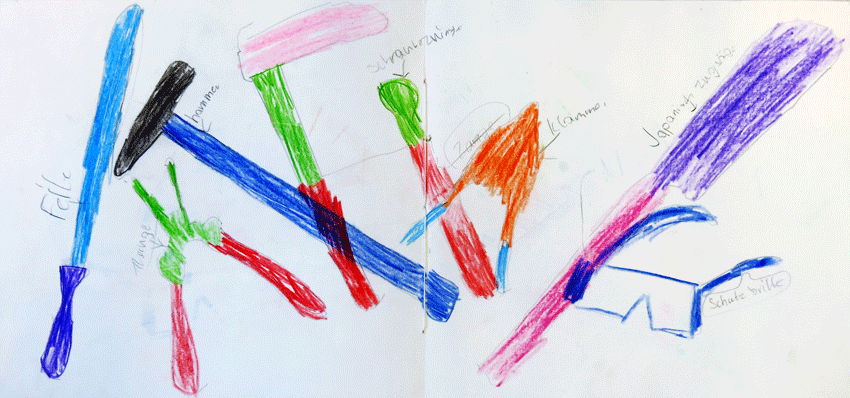 Ein großformatiges Kunst/Werkbuch für Texte, Bilder und Skizzen begleitet die praktische Arbeit der Kinder. Wir arbeiten darin täglich gemeinsam, es kann aber auch jederzeit frei gearbeitet werden. Hier werden Entwürfe gemacht, Ergebnisse und Ideen festgehalten, man kann sich auch mal zurückziehen und vertiefen, um in Ruhe zu zeichnen, wenn sonst an anderer Stelle gewartet werden muss.