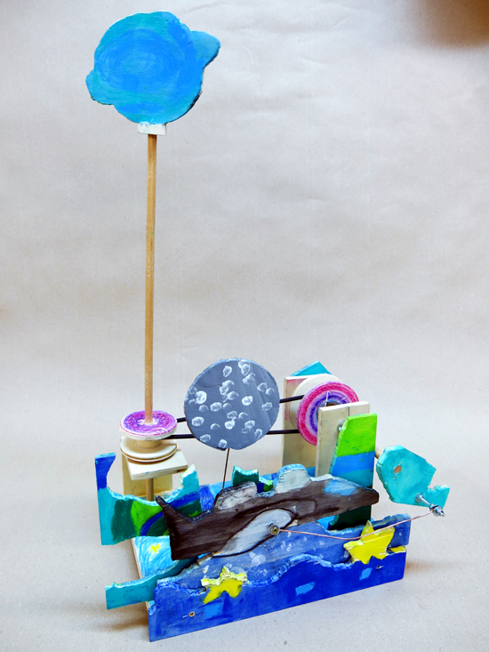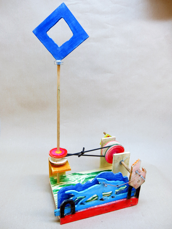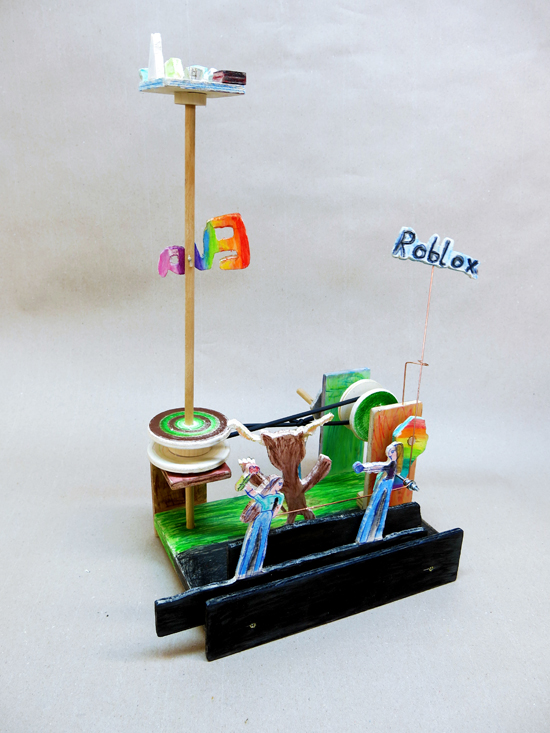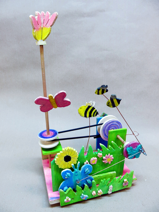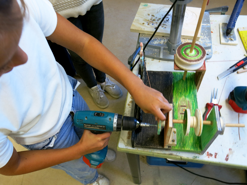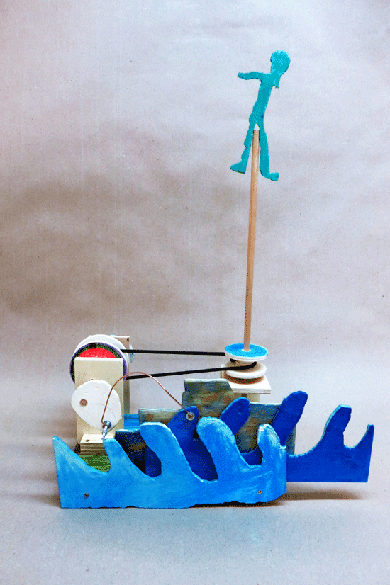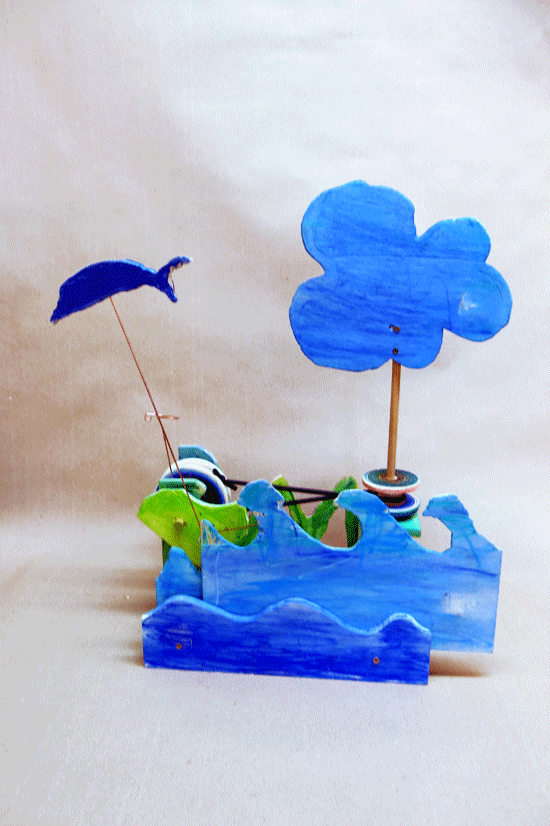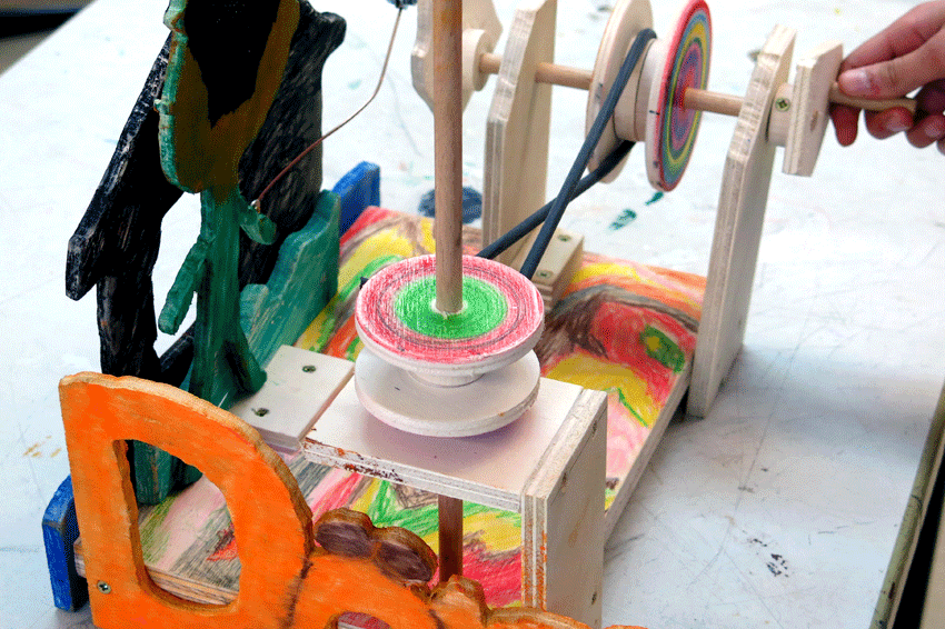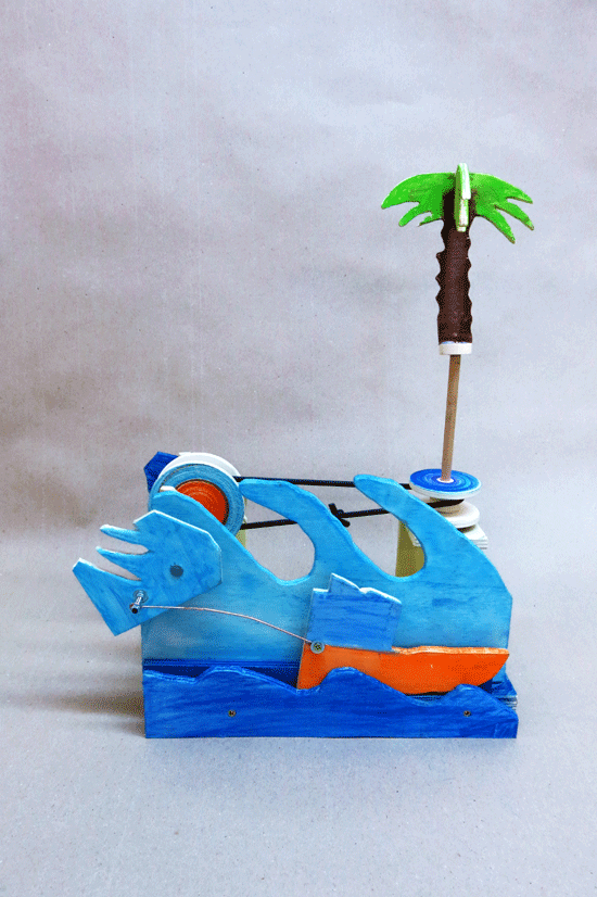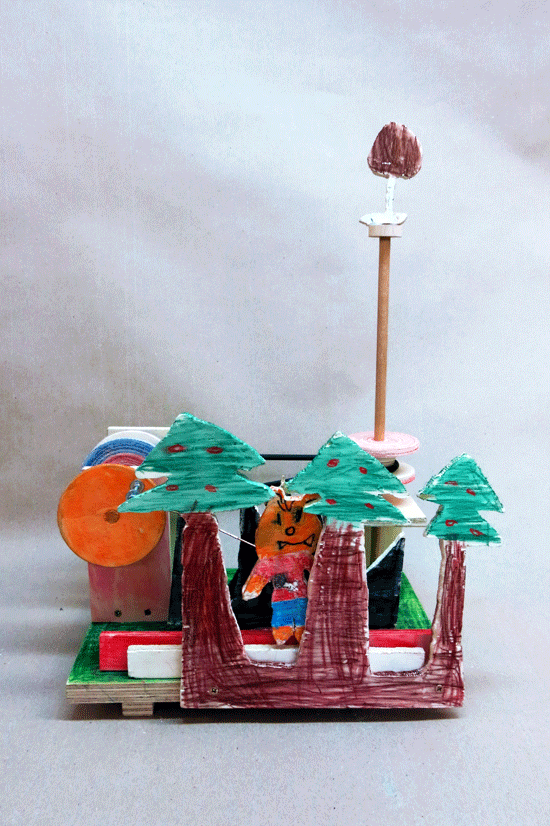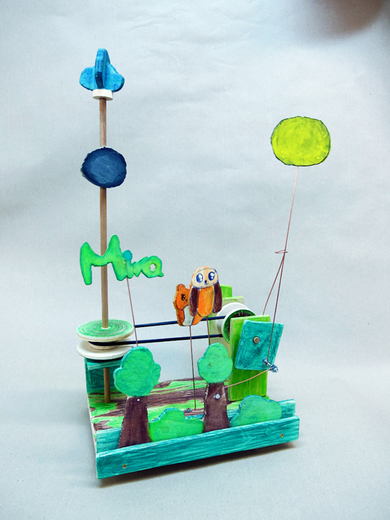 Der Aufbau der Maschine ist vorgegeben, die Ausführung ist bei jedem Kind anders. Unser Modell hat einen rotierenden Oktopuss und eine oszillierende Welle. Die Schüler*innen sollen sich ihre eigene Umgebung ausdenken und Dinge, Wesen oder Tiere gestalten die zu ihrem Thema passen.