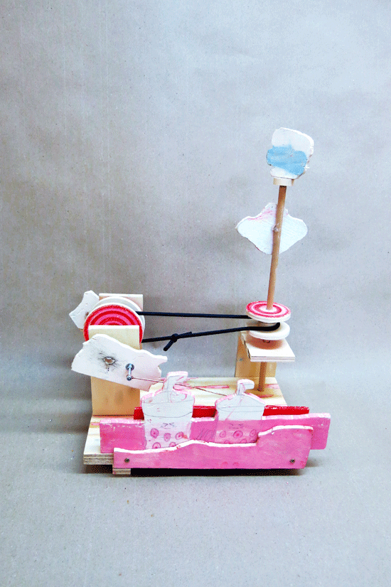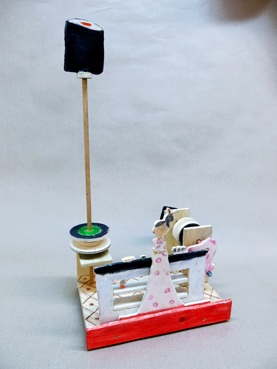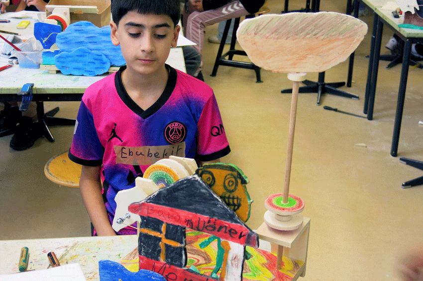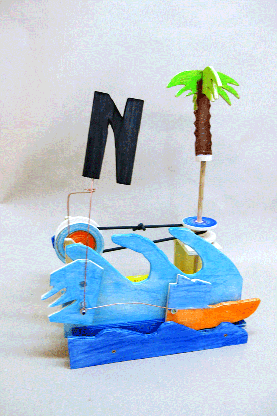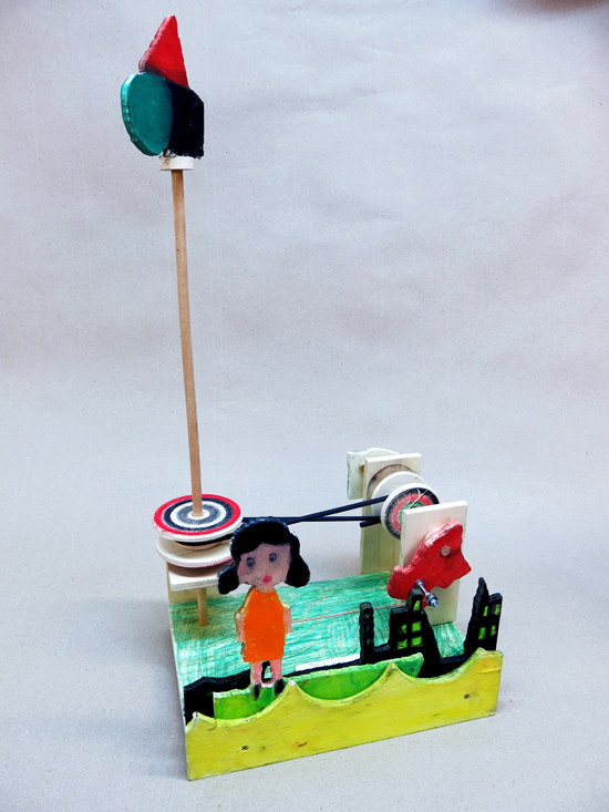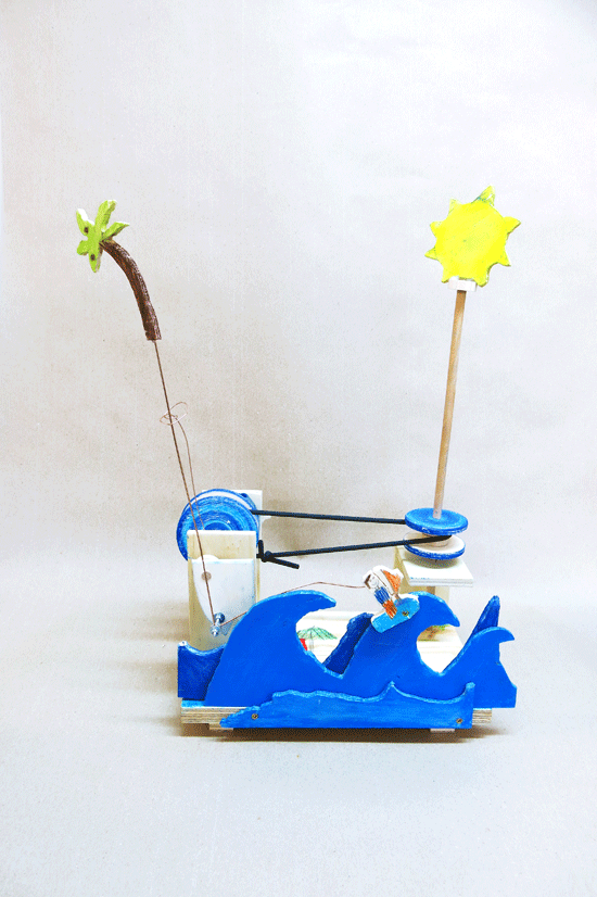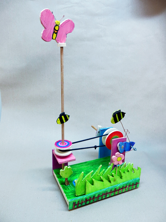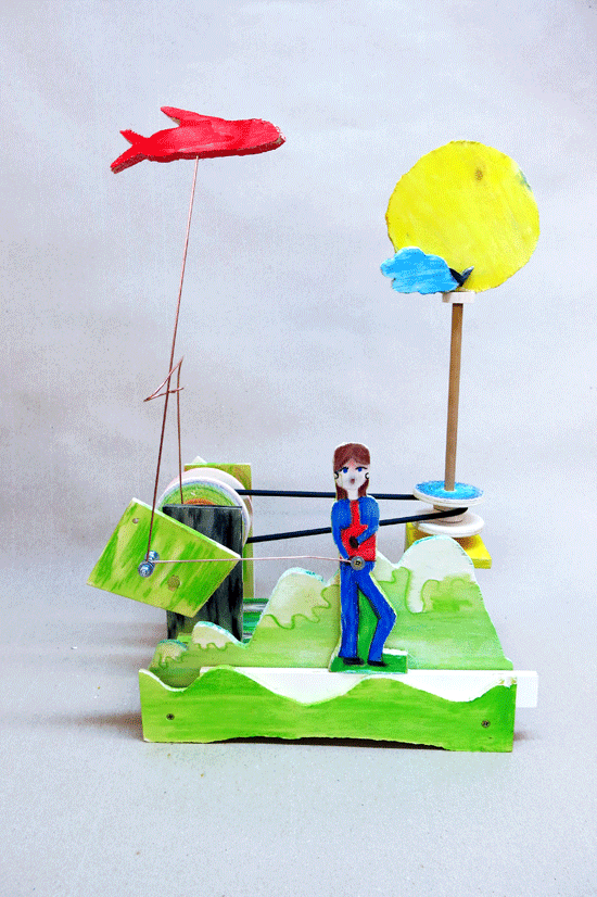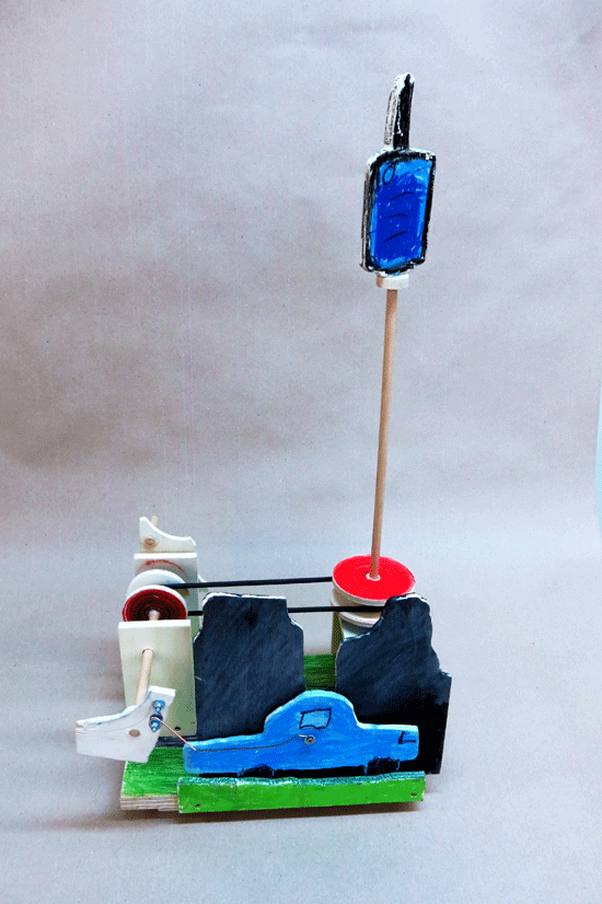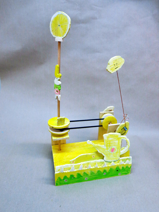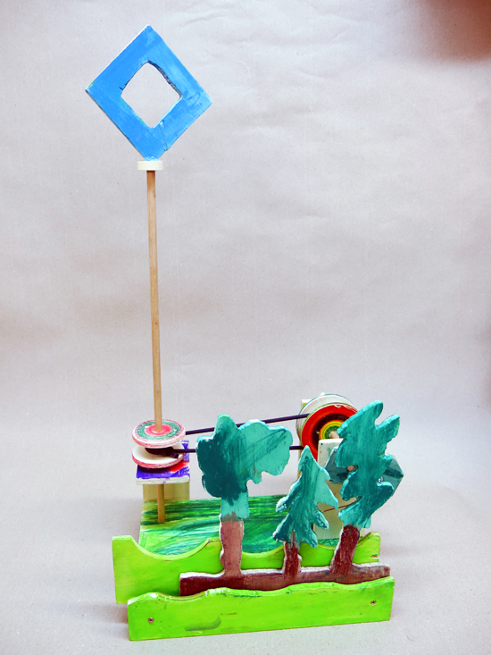 Der Aufbau der Maschine ist vorgegeben, die Ausführung ist bei jedem Kind anders. Unser Modell hat einen rotierenden Oktopuss und eine oszillierende Welle. Die Schüler*innen sollen sich ihre eigene Umgebung ausdenken und Dinge, Wesen oder Tiere gestalten die zu ihrem Thema passen.