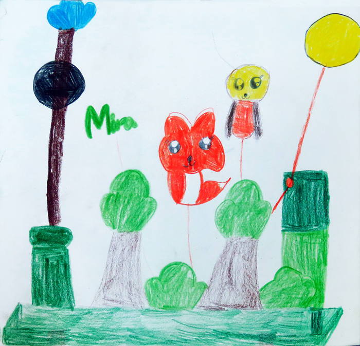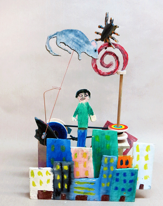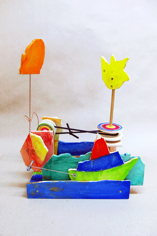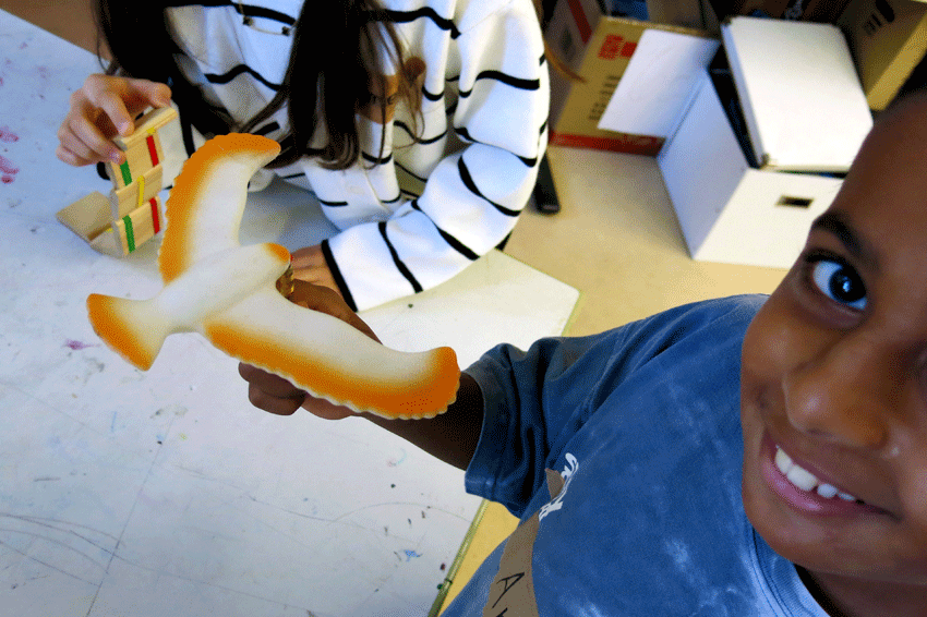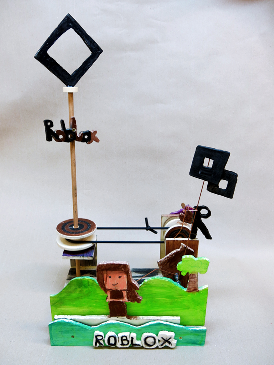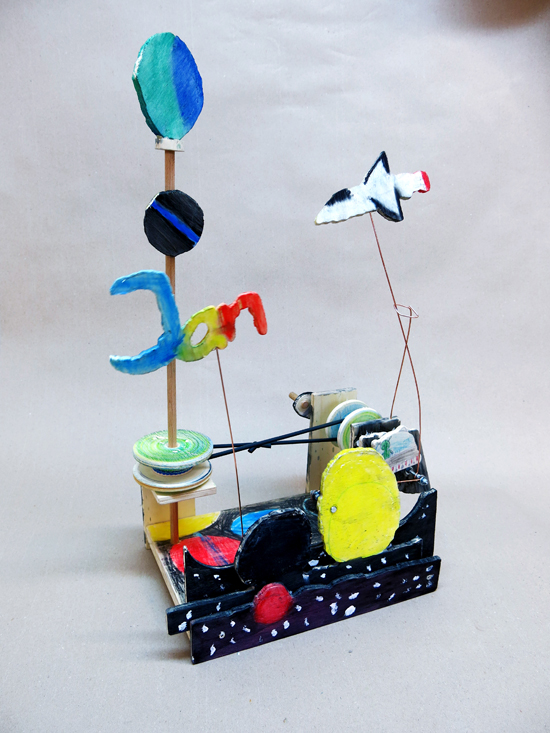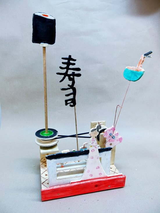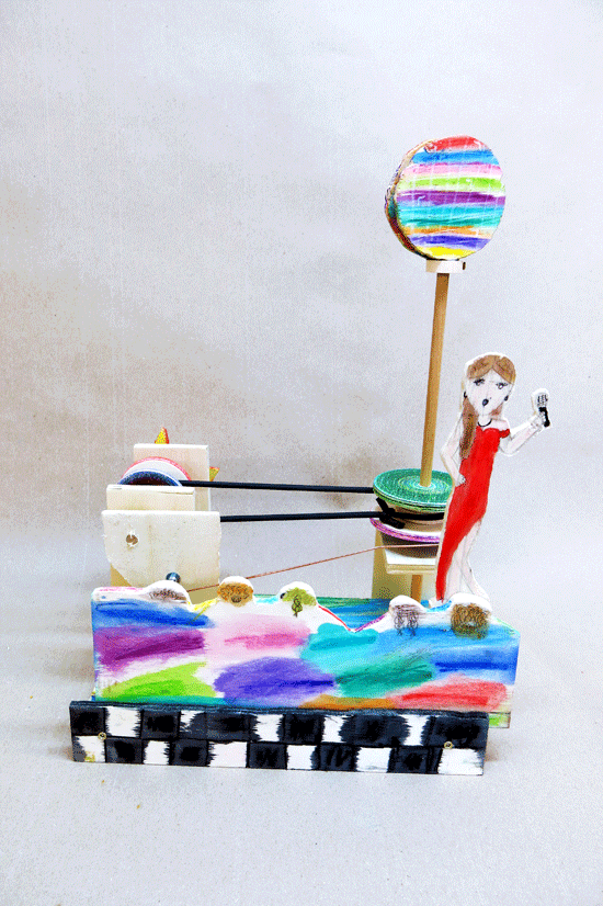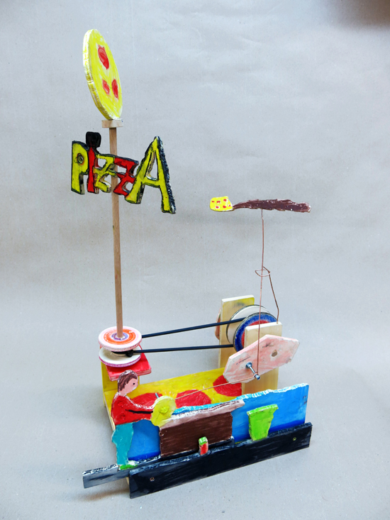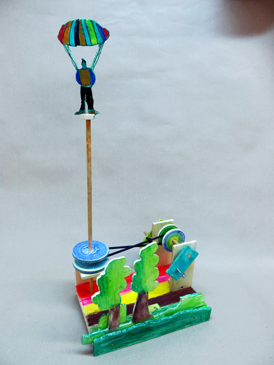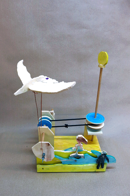 Der Aufbau der Maschine ist vorgegeben, die Ausführung ist bei jedem Kind anders. Unser Modell hat einen rotierenden Oktopuss und eine oszillierende Welle. Die Schüler*innen sollen sich ihre eigene Umgebung ausdenken und Dinge, Wesen oder Tiere gestalten die zu ihrem Thema passen.