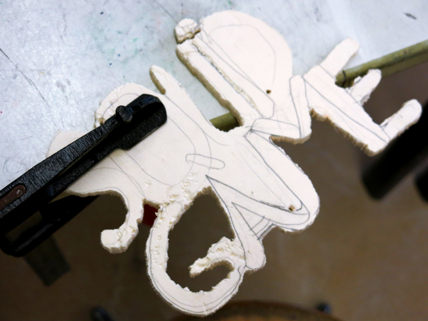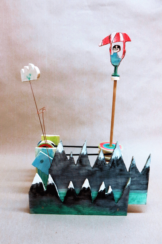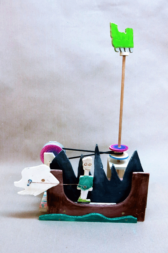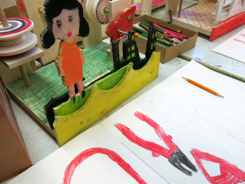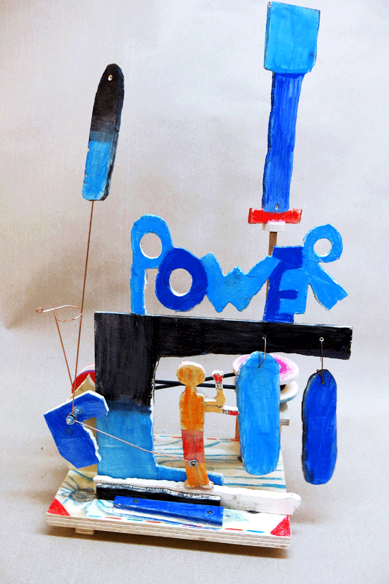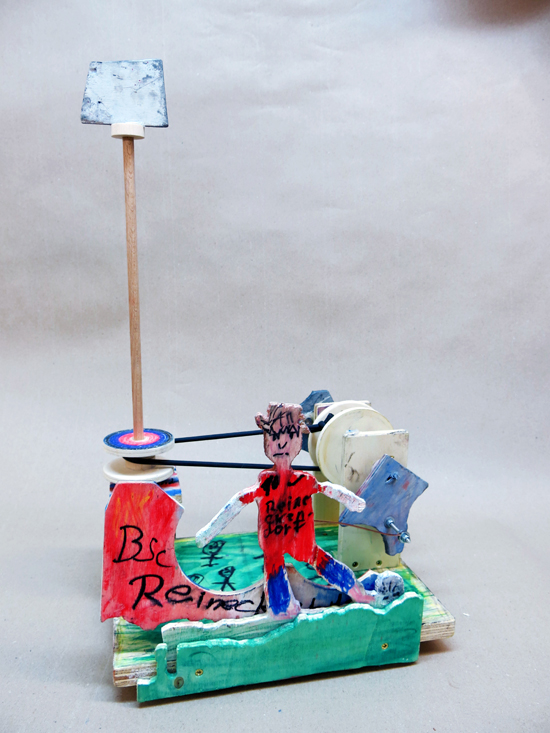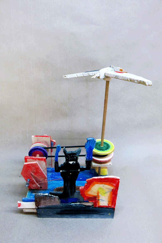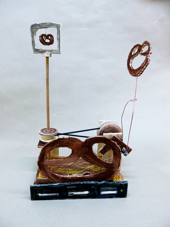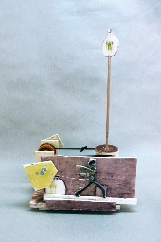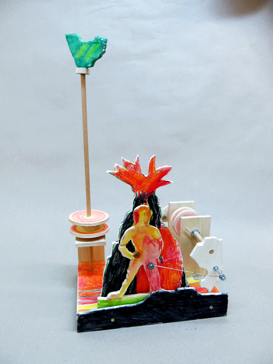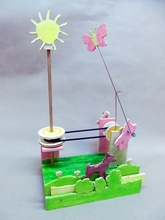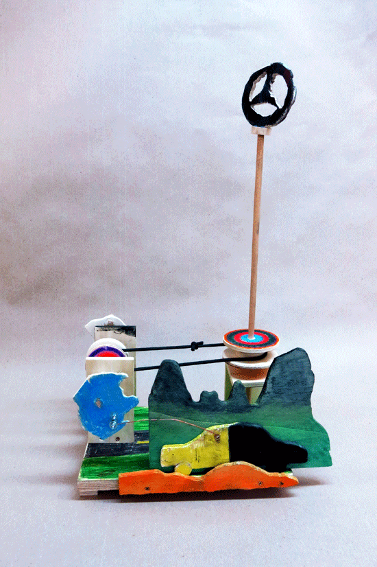 Auf eine Holzplatte montiert, durch eine Kurbel in Bewegung versetzt, bewegen sich gestaltete Teile rotierend im Kreis und durch eine Exzentzermechanik hin und her.