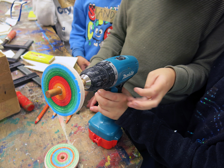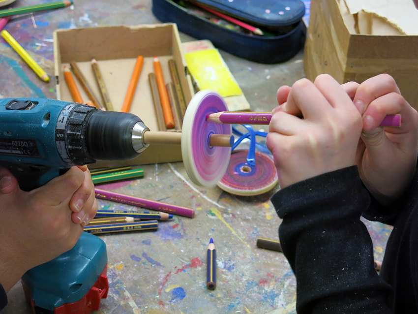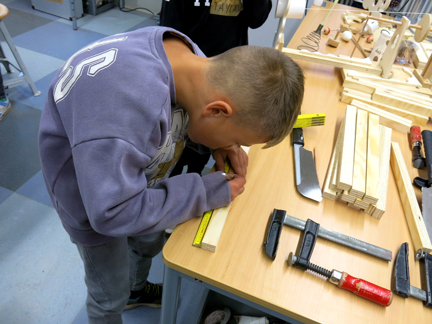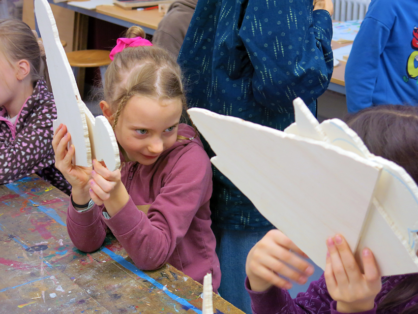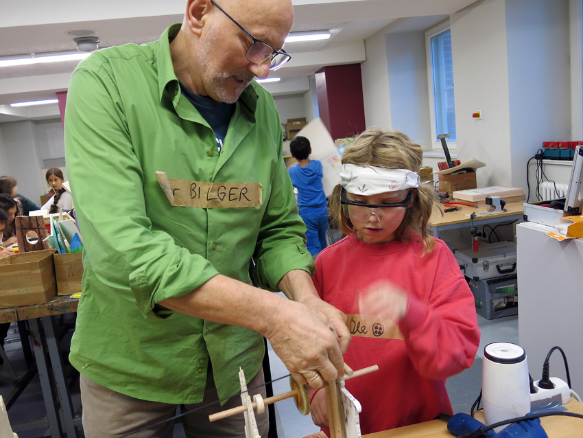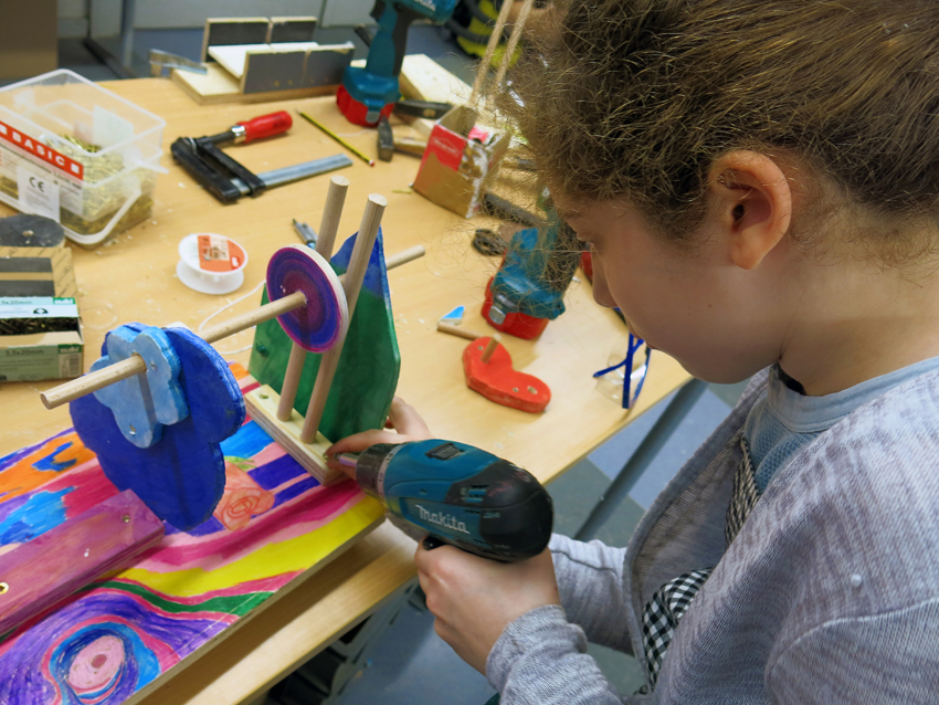 Die Schüler*innen lernen mit Werkzeugen und Handmaschinen umzugehen. Sie bearbeiten Holz, sägen, schrauben, bohren, malen, sie beobachten, konstruieren, korrigieren und erfinden. Sie lernen einiges über Physik: Die Funktion von Hebel, Exzenter, Reibung, Schwerkraft… Mit dem Physik-Crashkurs beginnen wir die Projektwoche, wir zeigen mechanische Spielzeuge und die Kinder sollen es spielerisch erkunden.
