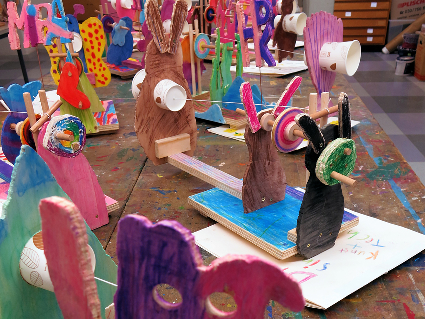 Während einer Präsentation am Ende der Woche stellen die Schüler*innen ihre Werke vor, andere Klassen werden eingeladen zum Schauen und Kurbeln. Anschließend nehmen die Schüler*Innen ihr Kunstobjekt mit nach Hause.