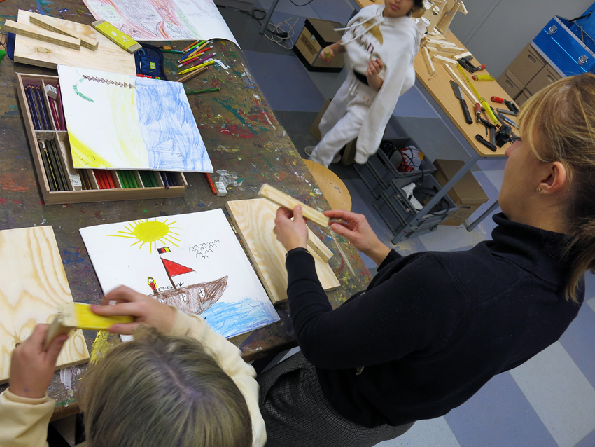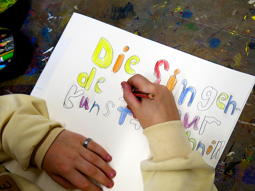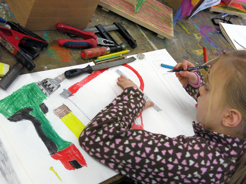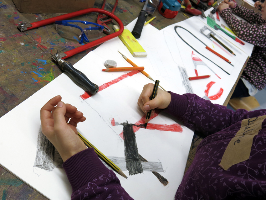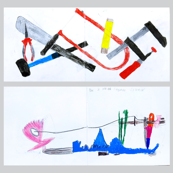 Jedes Kind führt parallel ein großformatiges Kunst/Werkbuch für technische Skizzen, gestalterische Entwürfe, Bilder, Fotos und vielleicht Geschichten.