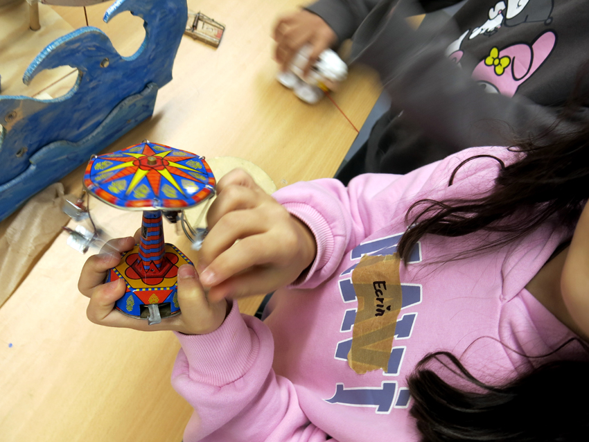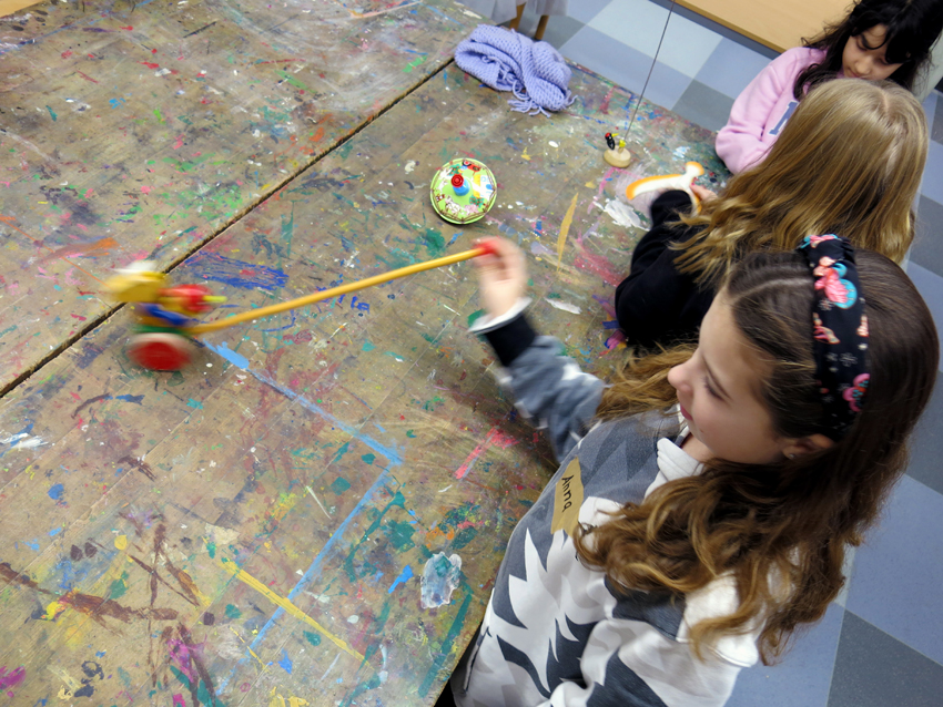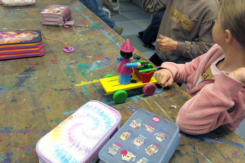 Zuerst analysieren wir einfache Bewegungsmuster anhand von mitgebrachtem beweglichem Spielzeug. Wir reflektieren die einfachen Bewegungsgesetze: wie funktionieren Kurbel, Wippe, Pendel, Kreisel... was bedeuten Antrieb, Reibung, Fliehkraft, Hebel, Stabilität? Was ist ein Exzenter? Dann nutzen wir die Theorie für die Praxis.