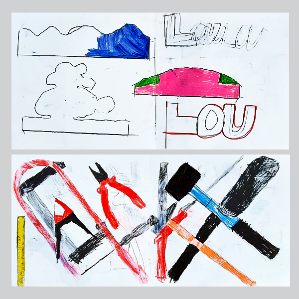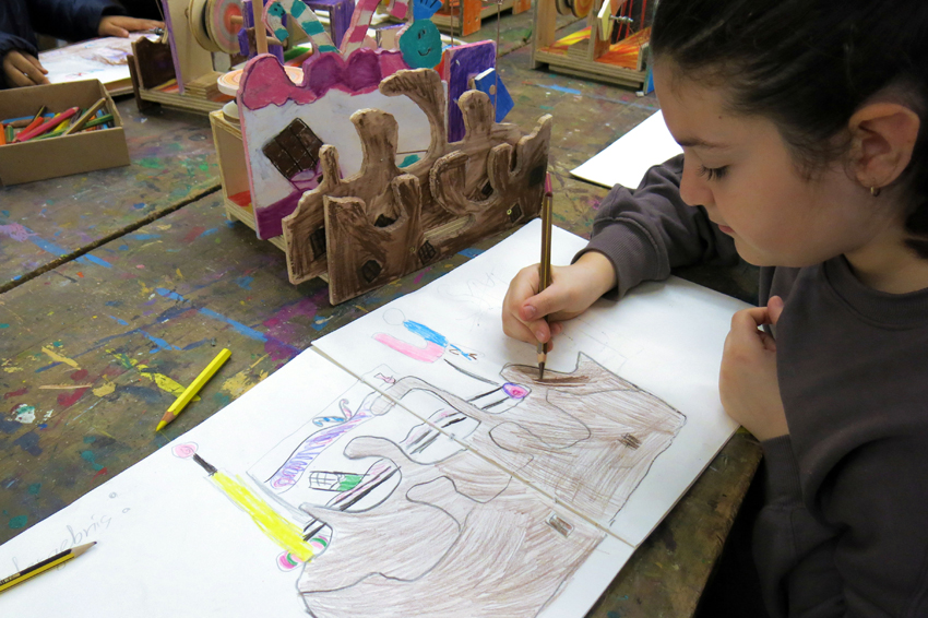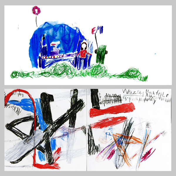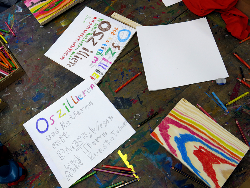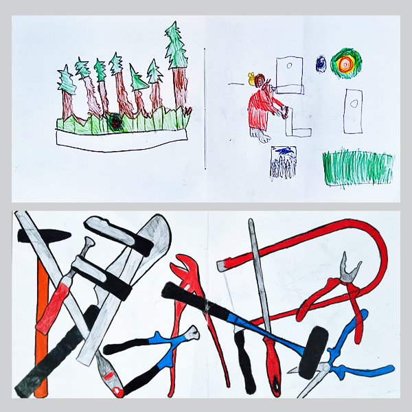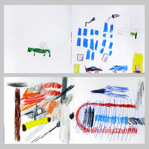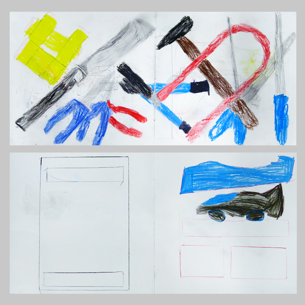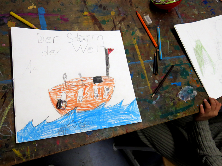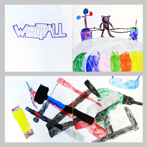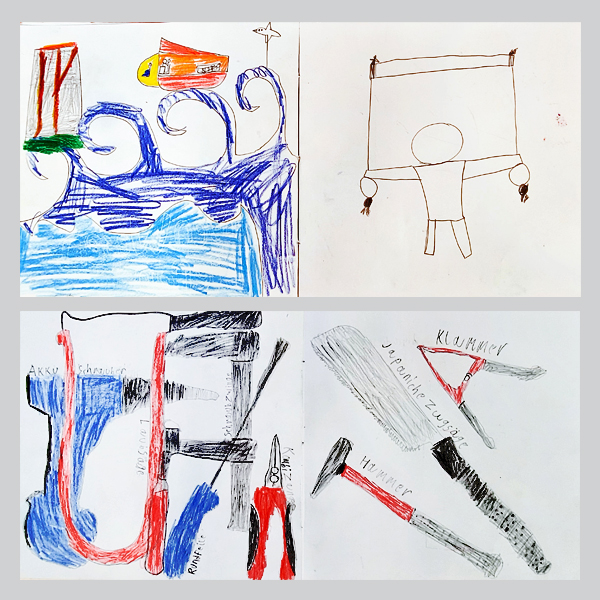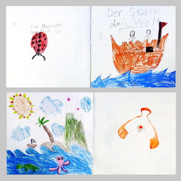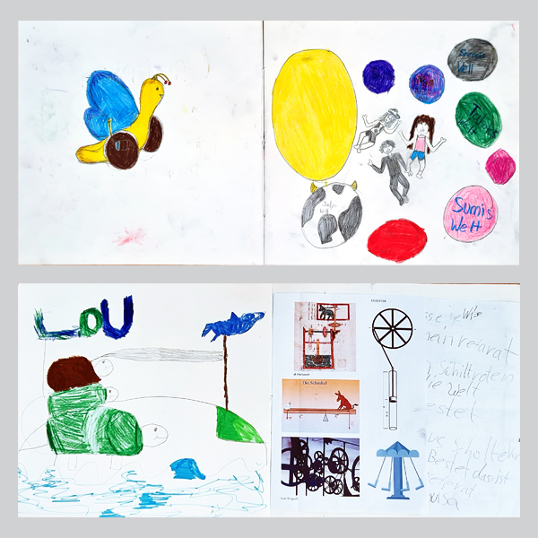 Ein großformatiges Kunst/Werkbuch für Texte, Bilder und Skizzen begleitet die praktische Arbeit der Kinder. Wir arbeiten darin täglich gemeinsam, es kann aber auch jederzeit frei gearbeitet werden. Hier werden Entwürfe gemacht, Ergebnisse und Ideen festgehalten, man kann sich auch mal zurückziehen und vertiefen, um in Ruhe zu zeichnen, wenn sonst an anderer Stelle gewartet werden muss.