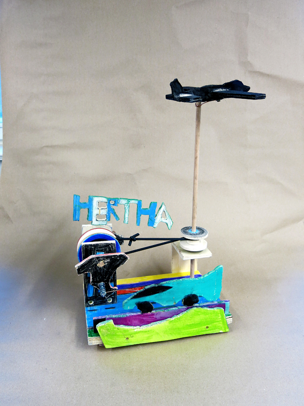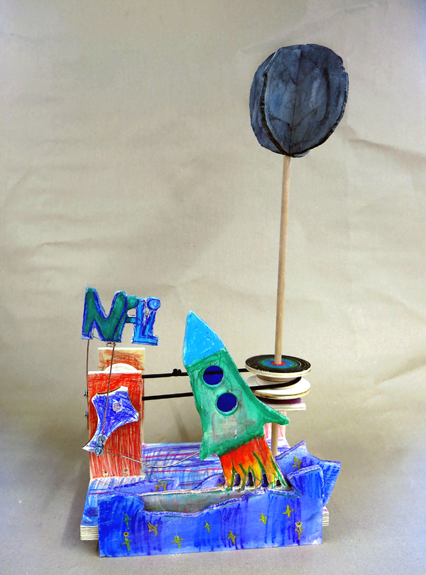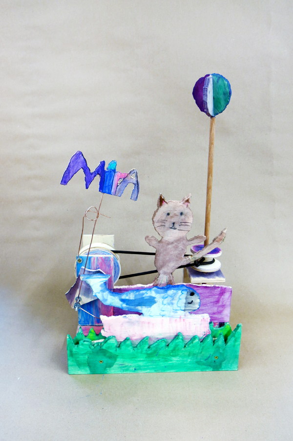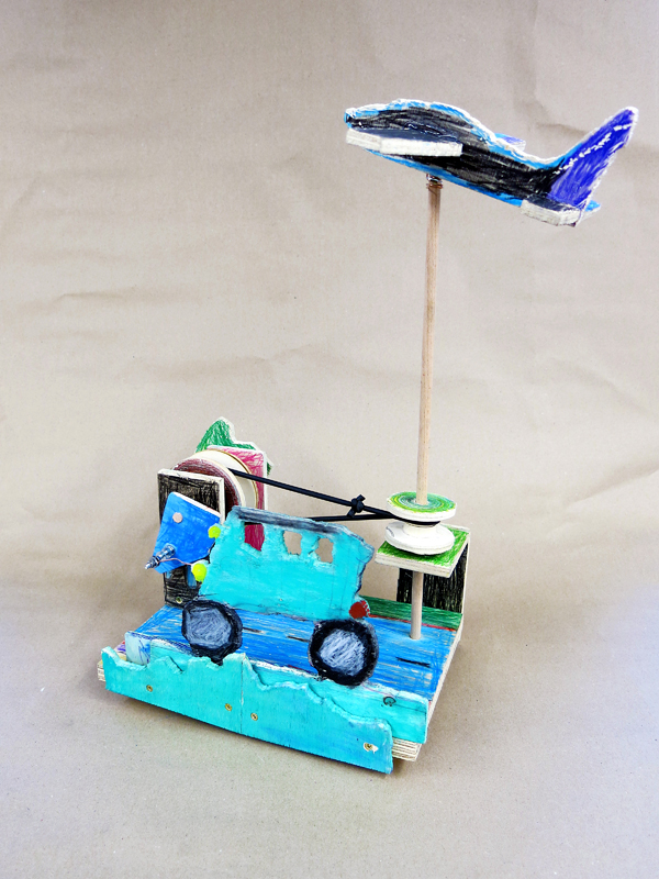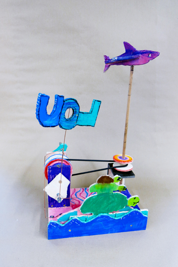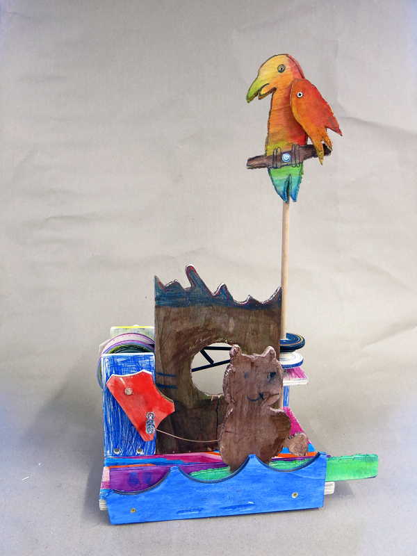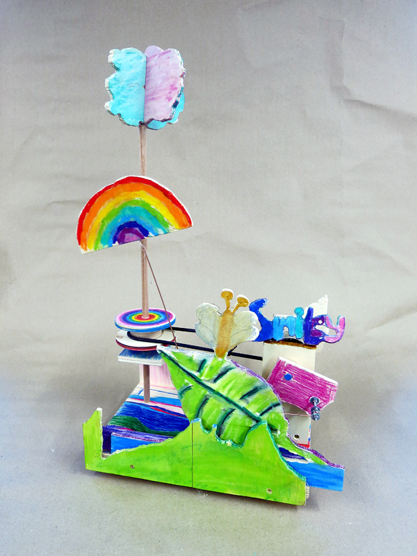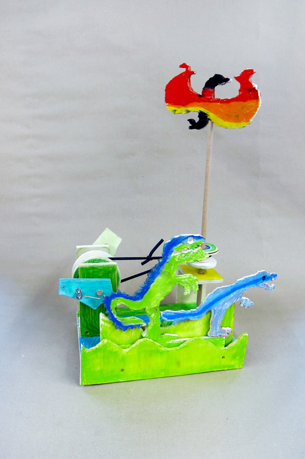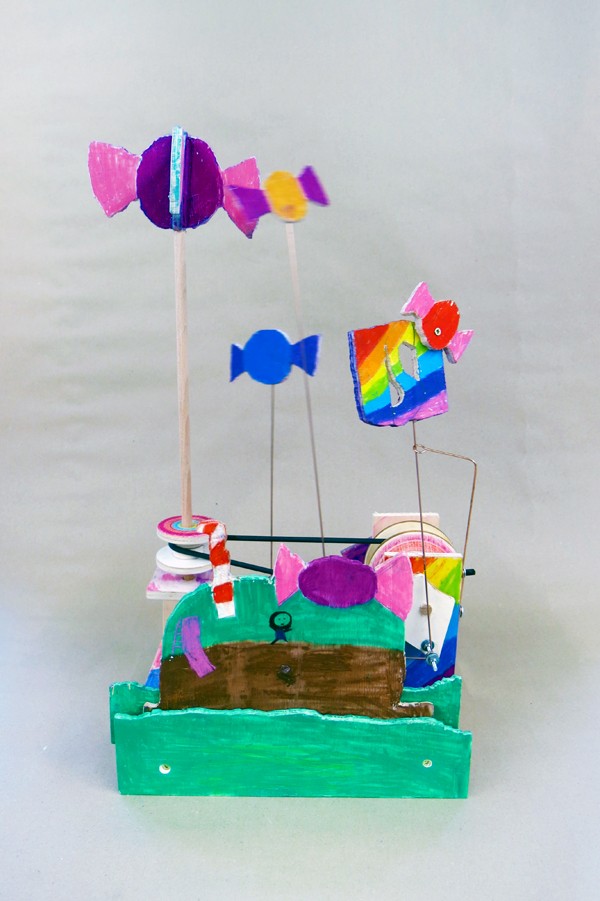 Der Aufbau der Maschine ist vorgegeben, die Ausführung ist bei jedem Kind anders. Unser Modell hat einen rotierenden Oktopuss und eine oszillierende Welle. Die Schüler*innen sollen sich ihre eigene Umgebung ausdenken und Dinge, Wesen oder Tiere gestalten die zu ihrem Thema passen.