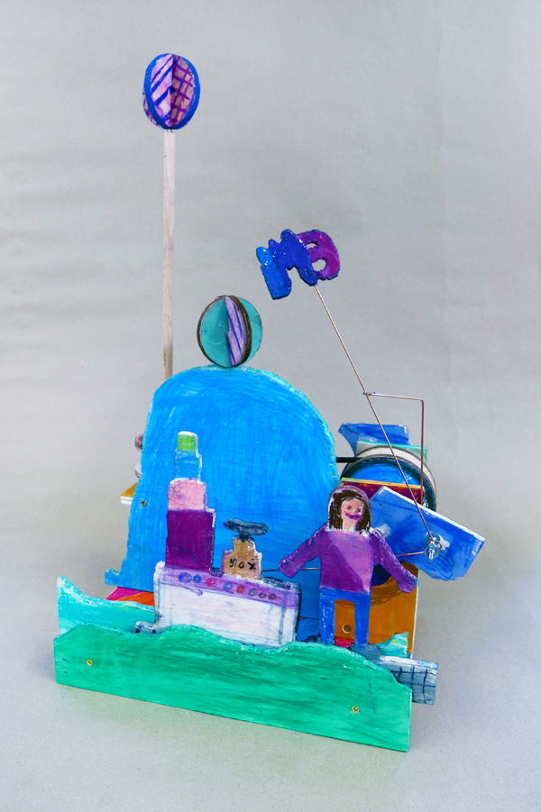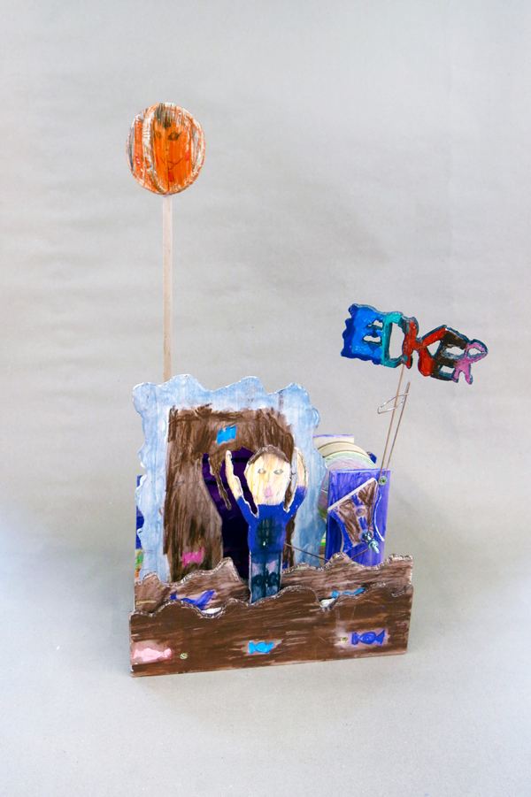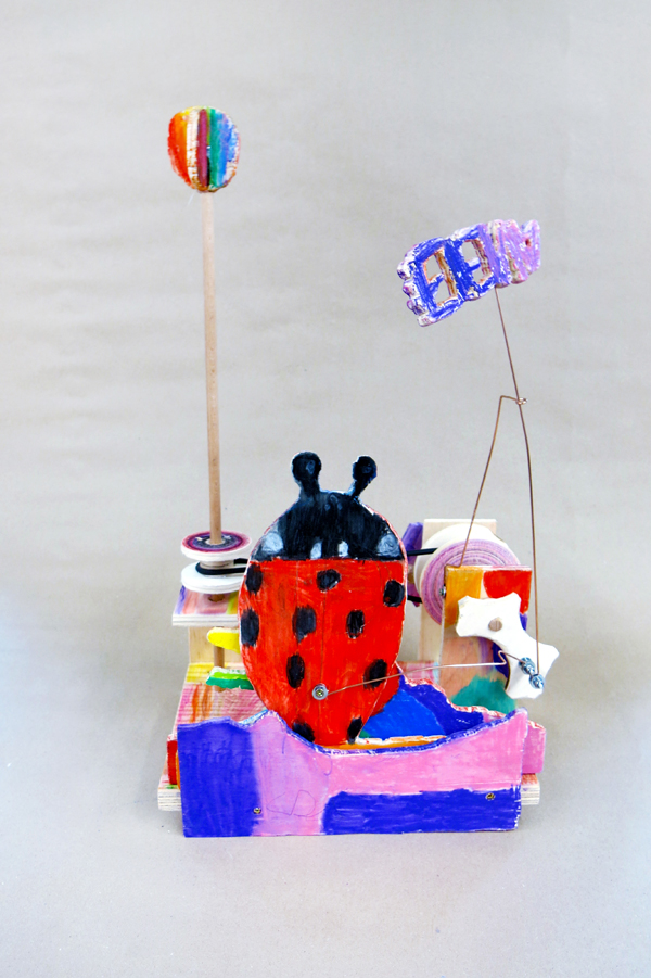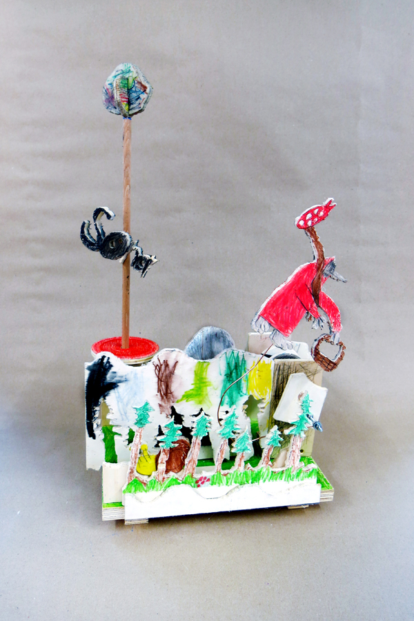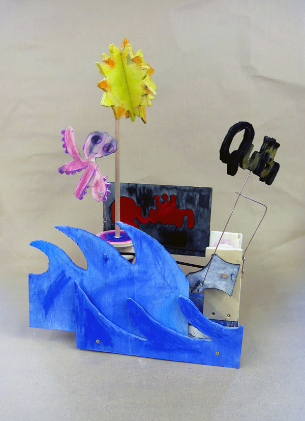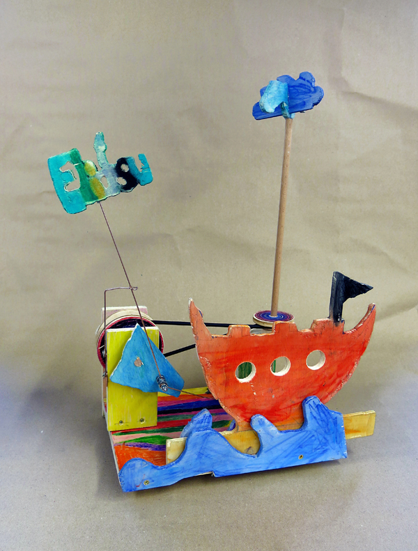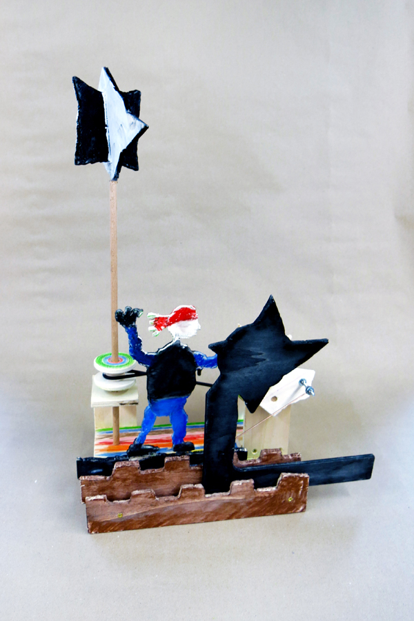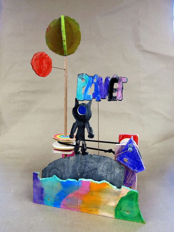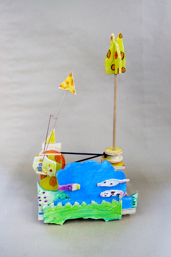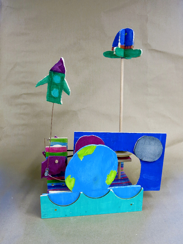 Der Aufbau der Maschine ist vorgegeben, die Ausführung ist bei jedem Kind anders. Unser Modell hat einen rotierenden Oktopuss und eine oszillierende Welle. Die Schüler*innen sollen sich ihre eigene Umgebung ausdenken und Dinge, Wesen oder Tiere gestalten die zu ihrem Thema passen.