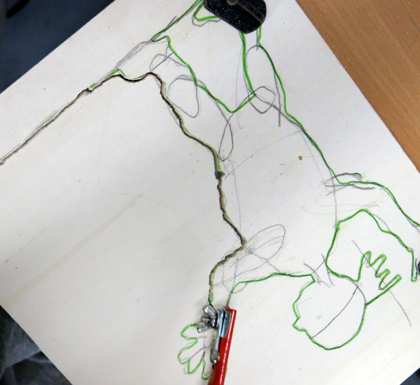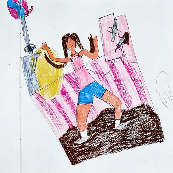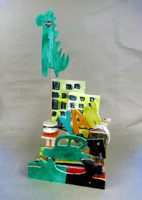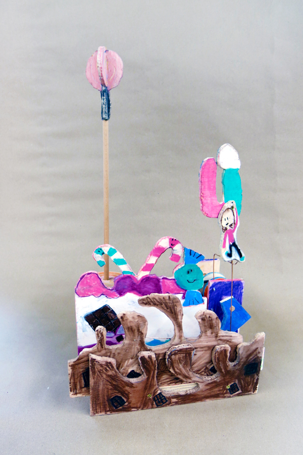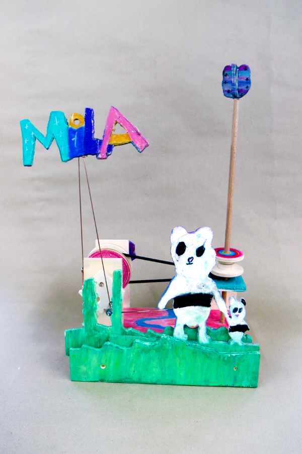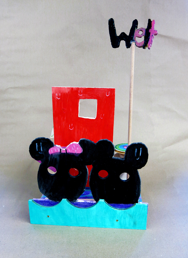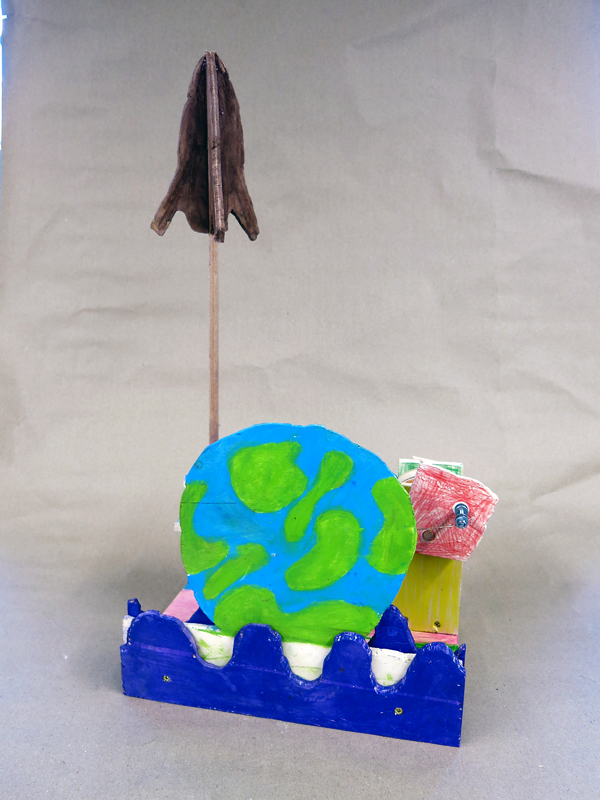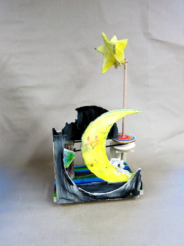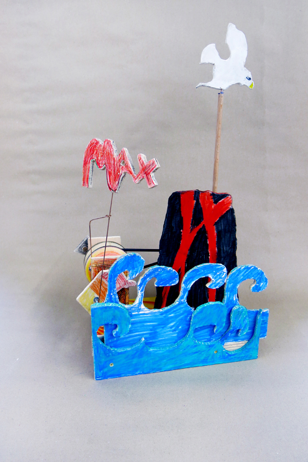 Der Aufbau der Maschine ist vorgegeben, die Ausführung ist bei jedem Kind anders. Unser Modell hat einen rotierenden Oktopuss und eine oszillierende Welle. Die Schüler*innen sollen sich ihre eigene Umgebung ausdenken und Dinge, Wesen oder Tiere gestalten die zu ihrem Thema passen.