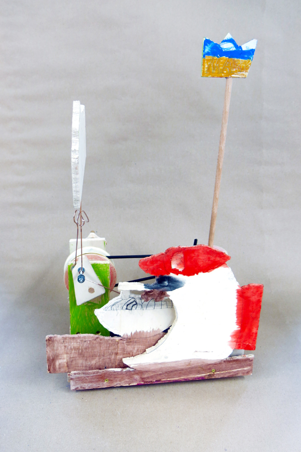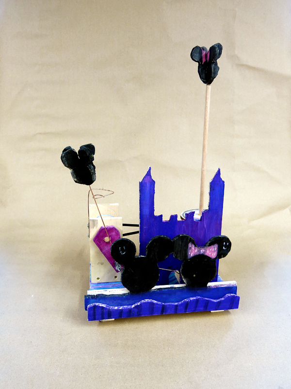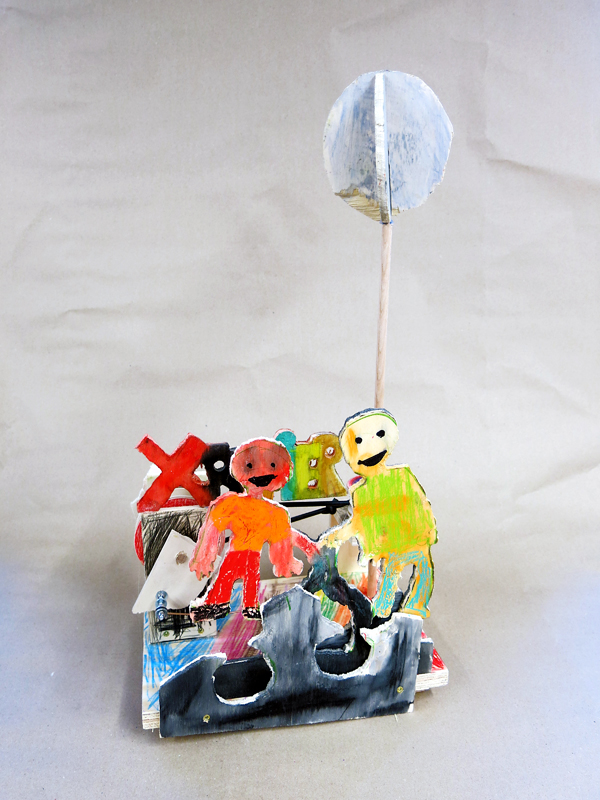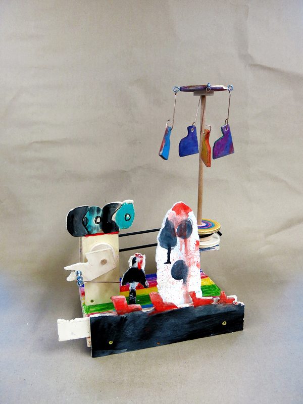 Auf eine Holzplatte montiert, durch eine Kurbel in Bewegung versetzt, bewegen sich gestaltete Teile rotierend im Kreis und durch eine Exzentzermechanik hin und her.