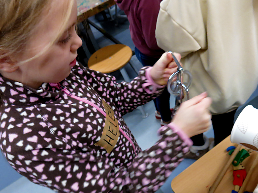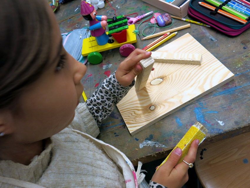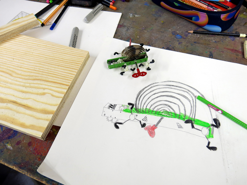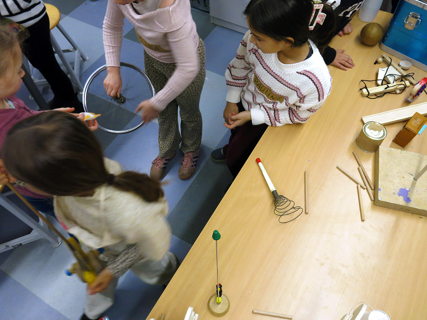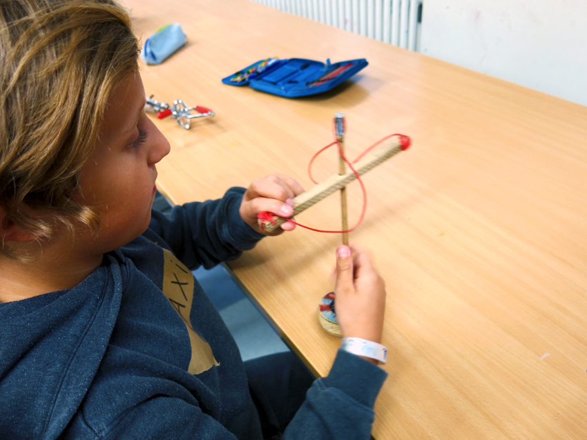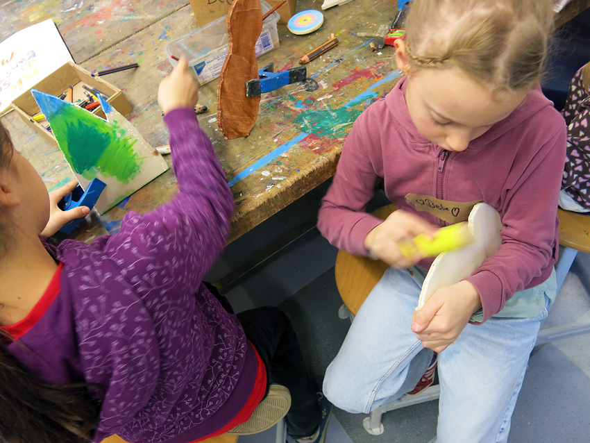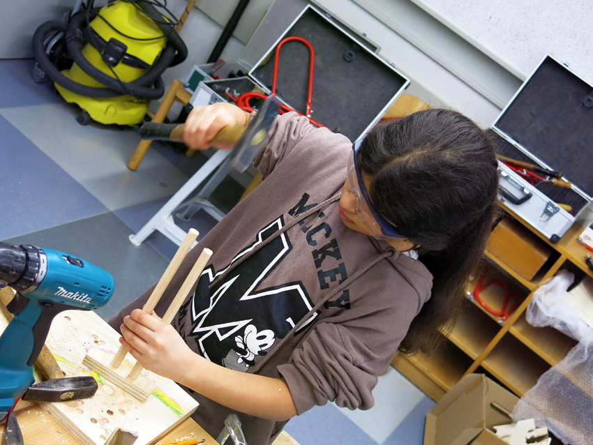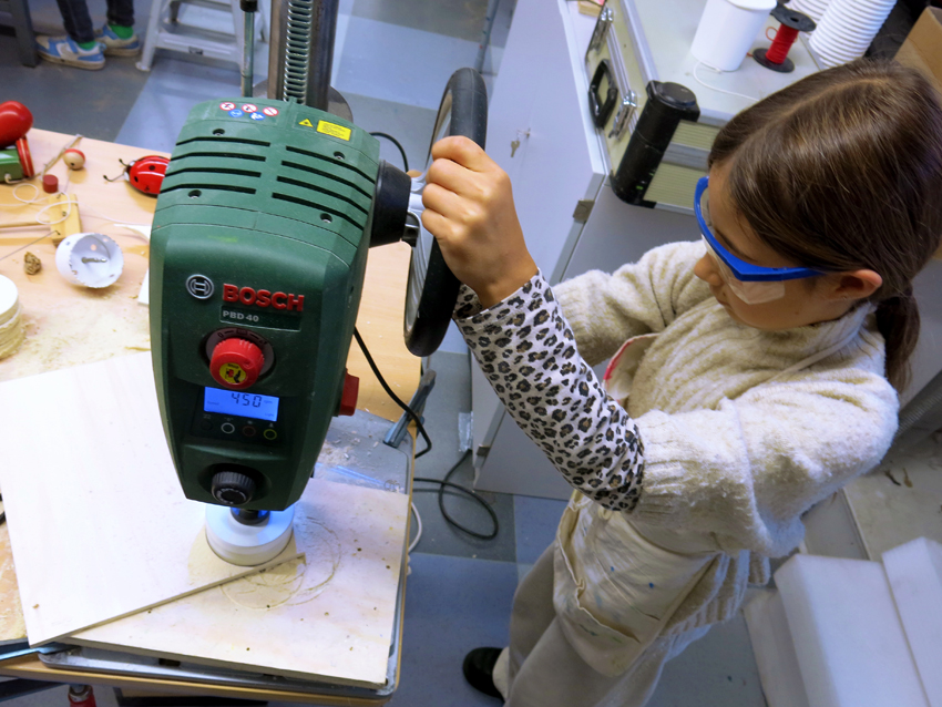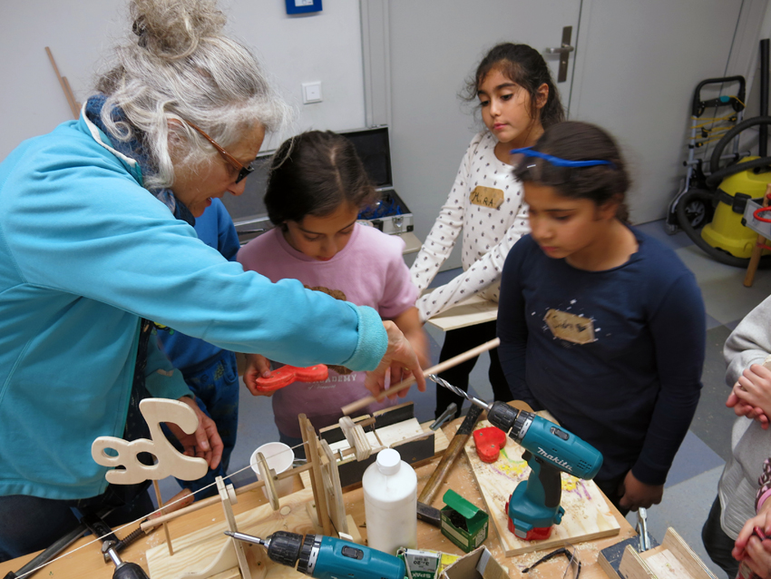 Die Schüler*innen lernen mit Werkzeugen und Handmaschinen umzugehen. Sie bearbeiten Holz, sägen, schrauben, bohren, malen, sie beobachten, konstruieren, korrigieren und erfinden. Sie lernen einiges über Physik: Die Funktion von Hebel, Exzenter, Reibung, Schwerkraft… Mit dem Physik-Crashkurs beginnen wir die Projektwoche, wir zeigen mechanische Spielzeuge und die Kinder sollen es spielerisch erkunden.